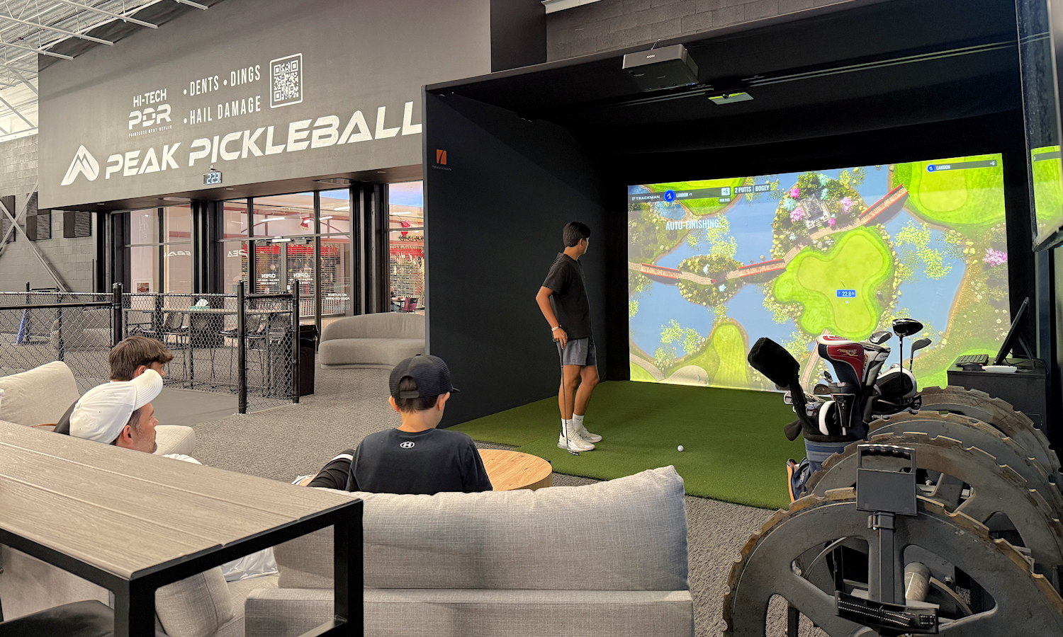 Peak Golf is located inside Peak Pickleball, Colorado Springs’ premier 24-court indoor pickleball facility. Whether you play golf, pickleball, both, or neither, Peak Golf offers an inviting space where anyone can have fun. Settle into our comfortable lounge-style setup—complete with couches, tables, and plenty of room for friends. Enjoy food and drinks while you play, with convenient access to Whistle Pig Brewing Co. right in our lobby and delicious Joey’s Pizza just steps away.